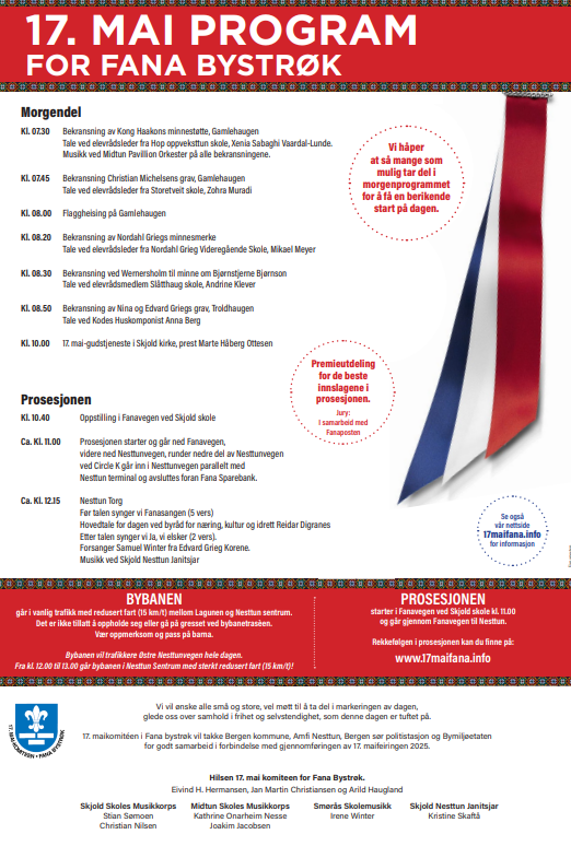 17. mai komiteen i Fana bystrøk ønsker Skoler, barnehager, lag og foreninger velkommen til å være med i prosesjonen på 17. mai.